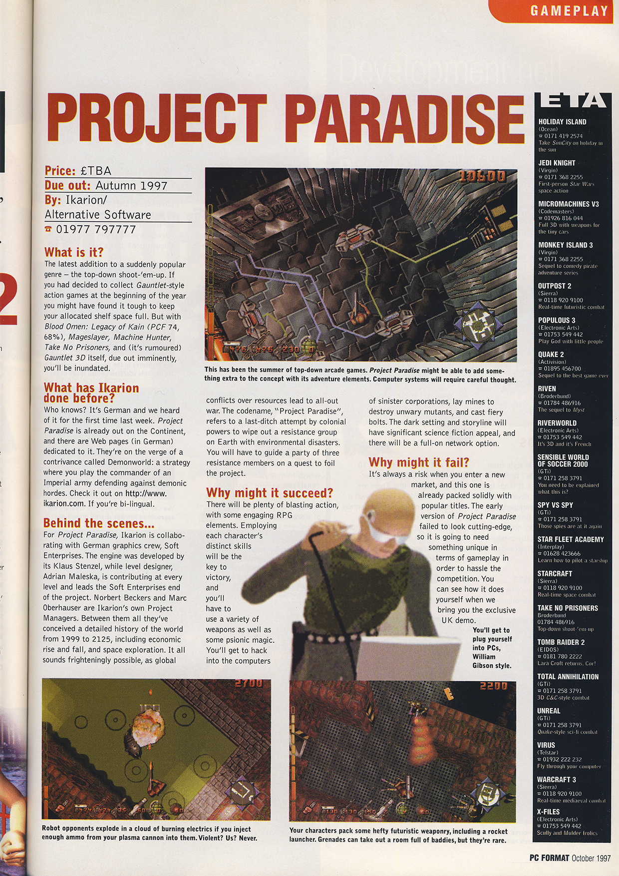 It looks like the developer, Ikarion has done quite a few action games in German (though some have translations), which probably explains the fact that I hadn't heard of these games before, their most popular title seems to be Demonworld (1997) (I also found its trailer and uploaded it on YouTube here). The publisher of Project Paradise, Soft-Enterprises, is of only minor interest, seeing that most of their releases are shovelware quality stuff.
